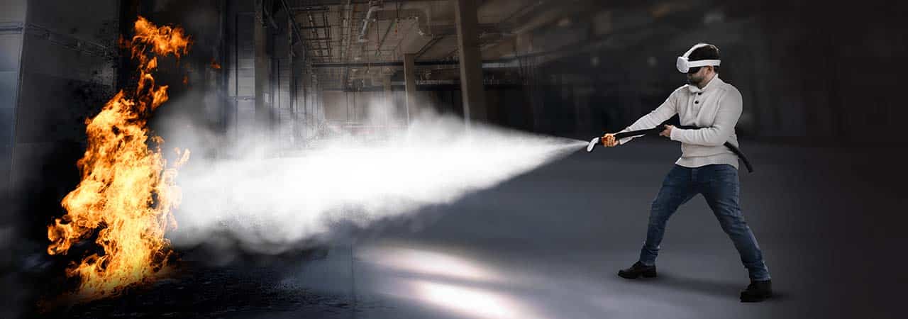 Casque VR-AR et manettes, deux extincteurs virtualisés, RIA optionnel. Sans risque pour vos stagiaires ni pour l'environnement.
